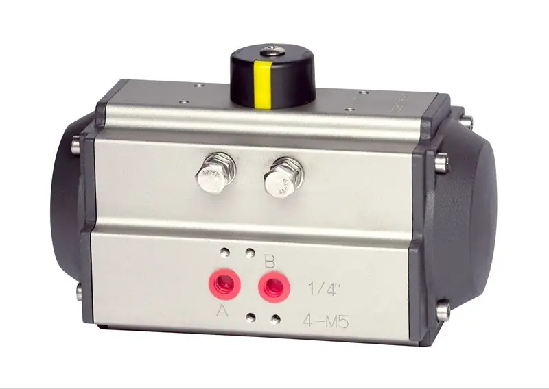 AT阀门气动执行器是将输入的气压信号转换成90度,再以扭转矩形形式输出的执行机构。该系列气动执行器是一种外型小、性能高的的执行结构,分为双气控型和单气控型两种,与角行程型控制阀组合可用于调节和开关的场合,也可用于其他回转运动的场合。